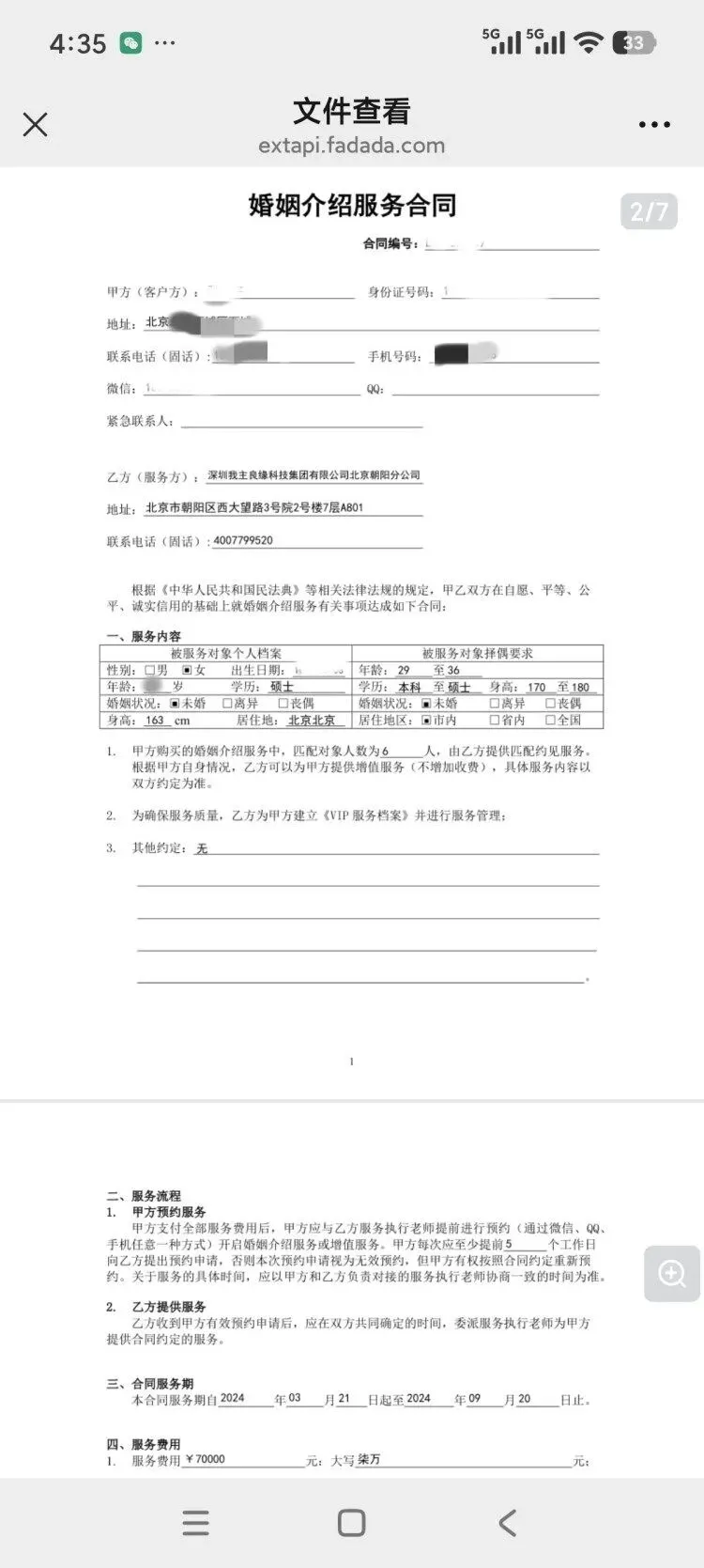 程诺告诉记者,该公司员工袁某某以“回访”名义将其约至婚介公司门店,诱导其签订了7万元的婚介合同。程诺出示的婚姻介绍服务合同显示,匹配对象为6人,由该公司提供匹配约见服务。合同服务期为半年,服务费用为7万元。“婚介服务中,他们还提供一些课程服务,比如恋爱技巧、穿搭等。”