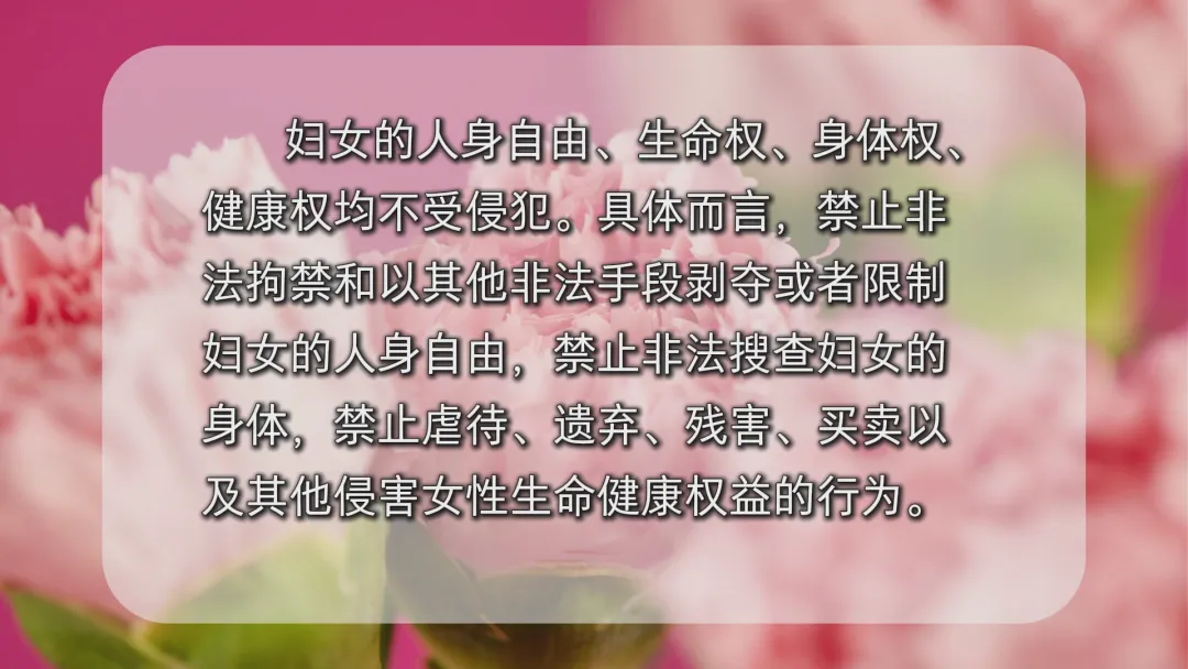 国家保障妇女享有与男子平等的人身和人格权利,让我们从人身权益保障、人格权益保护两个方面来看看妇女主要享有的人身和人格权益有哪些。