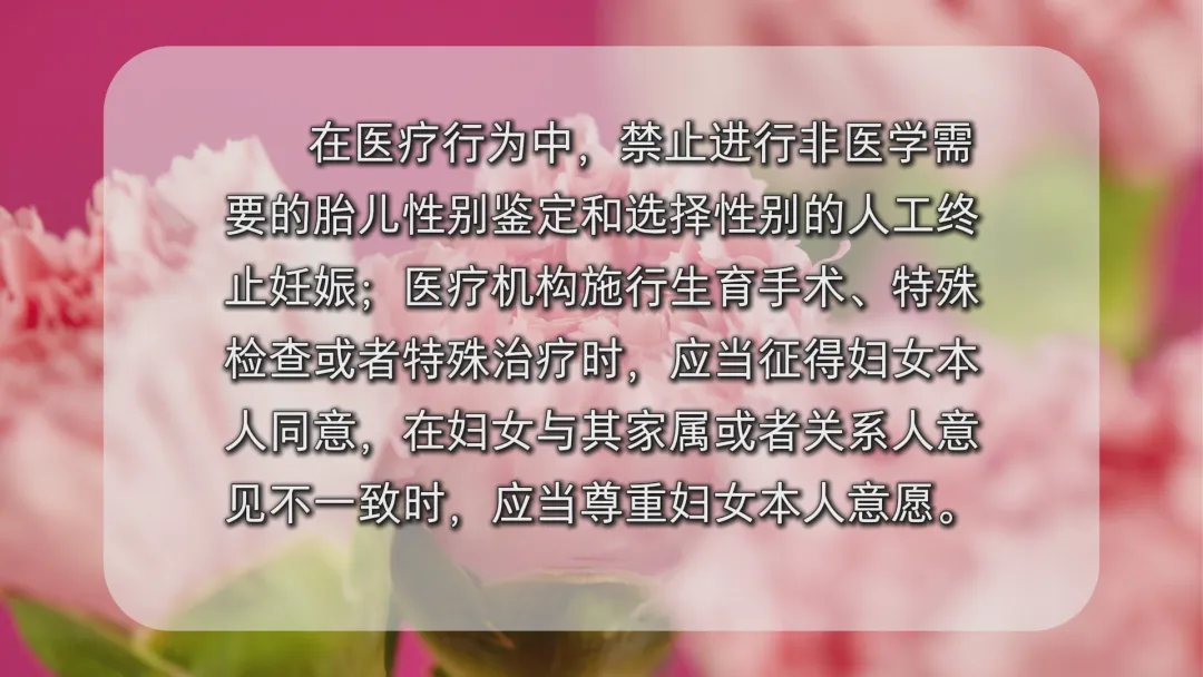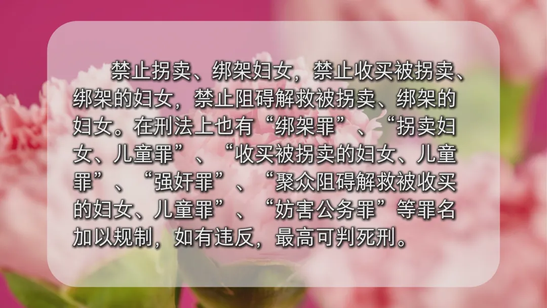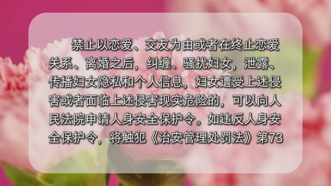 在人身权益保障方面,妇女的人身自由、生命权、身体权、健康权均不受侵犯。具体而言,禁止非法拘禁和以其他非法手段剥夺或者限制妇女的人身自由,禁止非法搜查妇女的身体,禁止虐待、遗弃、残害、买卖以及其他侵害女性生命健康权益的行为。在医疗行为中,禁止进行非医学需要的胎儿性别鉴定和选择性别的人工终止妊娠;医疗机构施行生育手术、特殊检查或者特殊治疗时,应当征得妇女本人同意,在妇女与其家属或者关系人意见不一致时,应当尊重妇女本人意愿。《妇女权益保障法》在第22条强调了禁止拐卖、绑架妇女,禁止收买被拐卖、绑架的妇女,禁止阻碍解救被拐卖、绑架的妇女。在刑法上也有“绑架罪”“拐卖妇女、儿童罪”“收买被拐卖的妇女、儿童罪”“强奸罪”“聚众阻碍解救被收买的妇女、儿童罪”“妨害公务罪”等罪名加以规制,如有违反,最高可判死刑。《妇女权益保障法》在《民法典》的基础上,聚焦女性权益,强调禁止违背妇女意愿,以言语、文字、图像、肢体行为等方式对其实施性骚扰,细化了学校、用人单位在预防和制止对妇女的性骚扰所应当承担的职责和采取的措施。受害妇女可以向有关单位和国家机关投诉,可以向公安机关报案,也可以向人民法院提起民事诉讼,依法请求行为人承担民事责任。在人格权益保护方面,妇女的人格尊严不受侵犯,妇女的姓名权、肖像权、名誉权、荣誉权、隐私权和个人信息等人格权益受法律保护。具体而言,禁止用侮辱、诽谤等方式损害妇女的人格尊严;媒体报道涉及妇女事件应当客观、适度,不得通过夸大事实、过度渲染等方式侵害妇女的人格权益;禁止通过大众传播媒介或者其他方式贬低损害妇女人格。《妇女权益保障法》在第29条将婚恋关系终止后妇女被纠缠、骚扰的情况纳入人身安全保护令的适用范围,为妇女采取防卫措施保护自身安全和权益提供了法律支持。法律规定,禁止以恋爱、交友为由或者在终止恋爱关系、离婚之后,纠缠、骚扰妇女,泄露、传播妇女隐私和个人信息,妇女遭受上述侵害或者面临上述侵害现实危险的,可以向人民法院申请人身安全保护令。如违反人身安全保护令,将触犯《治安管理处罚法》第73条有关规定,可处警告、罚款、拘留等处罚;情节严重的,还可能触犯《刑法》,以“拒不执行判决、裁定罪”定罪处罚,处三年以下有期徒刑、拘役或者罚金。