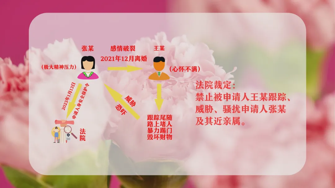 张某(女)与王某于2015年11月结婚,后双方因感情破裂于2021年12月离婚。离婚后,王某心怀不满,长期、多次通过跟踪尾随、路上堵人、暴力踢门、毁坏财物等方式威胁、恐吓张某及其近亲属,给张某及其近亲属造成极大的精神压力。为保护自身安全,2023年1月13日,张某向法院申请人身安全保护令。