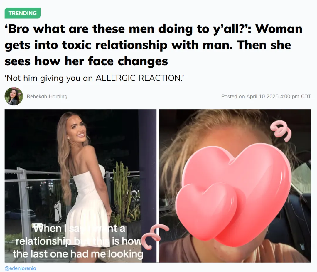图片来源于Daliy dot,版权属于原作者不久前,美国女孩Eden( @edenlorenia )就因为在tiktok 账号上分享了两张恋爱对比照片。