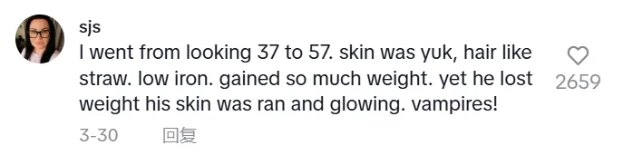 我从 37 岁的样子变成了 57 岁,皮肤很差,头发像稻草一样,缺铁,体重增加了很多。然而他却减肥成功,皮肤变得红润有光泽。吸血鬼!