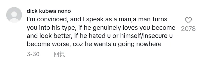 我确信,作为一个男人,我这么说,男人会把你变成他喜欢的类型,如果他真心爱你,你就会变得更好看,如果他讨厌你或他自己/没有安全感,你就会变得更糟,因为他想让你毫无进展