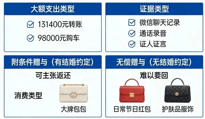 结合林先生和张女士的这件事来看,关键就在于林先生的大额支出,是否有明确的结婚附加条件,而这一点需要具体证据来证明。如果林先生能拿出微信聊天记录、通话录音、证人证言等有效证据,证明自己转131400元、买98000元的车,都是为了和张女士结婚,那这部分支出大概率会被认定为附条件赠与,林先生可以依法主张返还;但如果是没有结婚约定的大牌包包、日常节日红包、护肤品服饰等消费,被认定为无偿赠与的话,就很难要回。