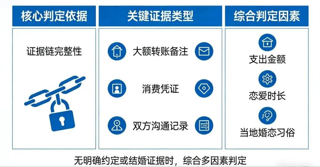 另外,从海南本地司法实践来看,这类纠纷的处理,很看重证据链是否完整。恋爱期间的大额转账备注、消费凭证、双方沟通记录等,都是判定支出性质的重要依据。要是双方没有明确约定支出性质,也没有足够证据证明是为结婚支出,法院会结合支出金额、恋爱时长、当地婚恋习俗等综合因素来判定。 |