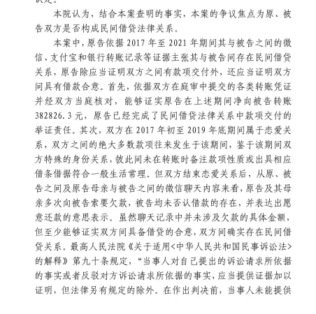 本案中,一审法院认为“被告强调案涉款项的性质系双方恋爱期间为共同生活所进行的开支,但被告并未提交任何证据证实案涉款项实际用于了双方恋爱期间的共同生活,被告应当承担举证不能的法律后果”。但其实在本案一审中,被告仅仅是否认了双方存在借贷,并未以转账系偿还双方之前借款或其他债务作为抗辩理由,也就是并不符合《若干问题的规定》第十七条的情形,因此原告仍应对双方存在借款382826.3元的借贷合意承担举证证明责任。然而,原告所提交的证据中均未提及双方所有的转账或是转账差额的金额存在借贷性质。笔者认为,原告的举证并没有初步达到借贷合意的证明标准,原告仍应进一步举示证明。