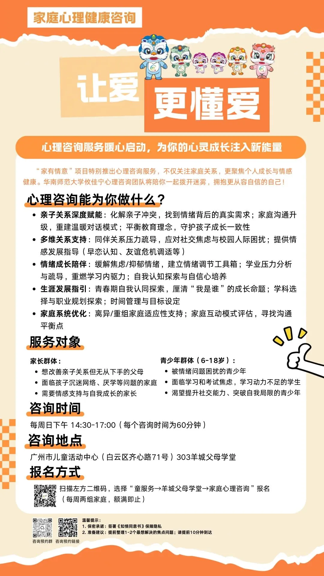 还特别开放了“心理健康咨询”,通过暖心且专业的心理咨询服务,为爱赋能,助力心灵成长,让爱更加深刻与理解。接下来,让我们一同开启“羊城父母学堂”第五十六期的精彩旅程吧!