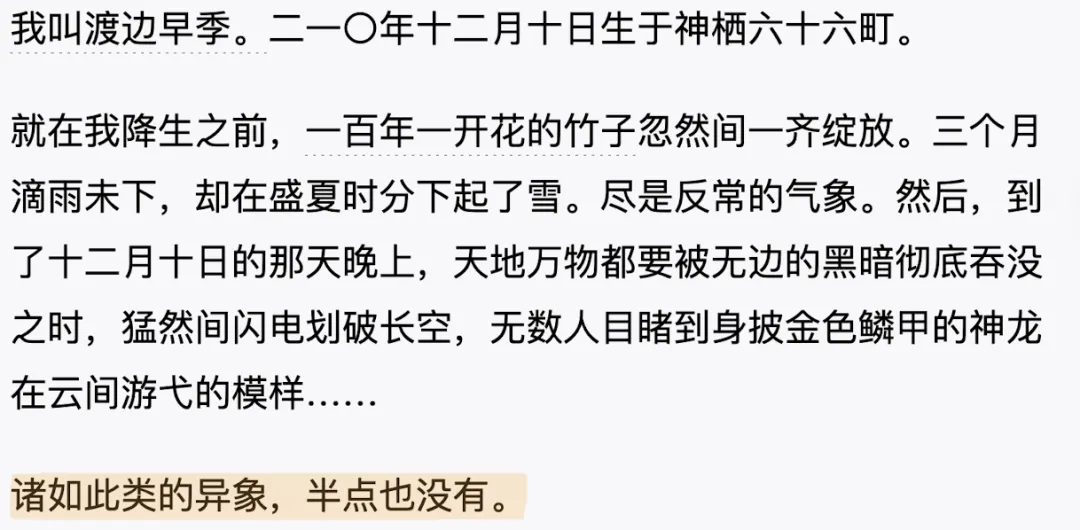 故事的开端在于我昨天看到了B站一位up主的视频,把这个图贴在下面,大家也可以自行观看那个视频,做的非常好,她比我的看番量还要大一些,而且思路清晰,很有说服力,我很喜欢捏。当然,她讨论的是少年漫这个范围内的女性角色。对于我来说,火影是我的入坑作,当年我在优酷看的时候,就看到有很多人对小樱有很多不文明用语的评价。那么这个up主她跟我的观点是一样的,其实小樱反而是岸本老师在努力雕刻的一个角色,从一开始就设计了一个成长路线。那可能是因为火影一开始设计的时候其实是一个中篇连载,但到了后面发现人气很高,就一直连载了十几年,导致她的成长路线有一种“一年三熟”的感觉具体来说就是比如说在故事开篇的时候,第三话小樱对着佐助说「鸣人总爱捉弄我,这是因为他没有父母好好教育他。」其实这句话有人截出来说日语原文是没有接受过良好的教育,再加上重点是鸣人经常捉弄小樱,就是比如说,大家想一想,如果有一个男生一直坚持不懈的在全班人面前跟你表白,哪怕你一直不答应,他也每天过来,弄得你很难堪。在这种情况下,你确实很难对他产生一些正面的情感。岸本老师的设计思路其实很清晰,就是小樱从一开始不认可鸣人,到最后与鸣人一起并肩作战,重新认识了鸣人的成长,然后喜欢上鸣人的一个过程。但是在这个过程当中呢,你可以明显的看到,在中忍考试期间,小樱割头发那一段就已经代表了他成长起来,要守护自己同伴们的决心。但是到了中忍考试最后一场木叶崩坏计划的时候,鹿丸提出要殿后去阻拦很强大的敌人,小樱心里居然想的是鹿丸会不会偷偷逃走。这句话完全不应该出现在已经有觉悟的小樱的口中,何况鹿丸和小樱之间又没有什么不好的回忆,他们就是很普通的同学关系,这就是我说了一年三熟的问题:感觉这个人,成长了,又回去了;成长了,又回去了。不过,关于最后那一句我终于追上你们了那句话,我有一个看法。很多人就拿着这句话来嘲讽小樱,但我觉得追上你们了这句话不代表绝对的武力值维度,难道救病治人就不伟大吗?鸣人和佐助能够治疗他人的疾病吗?他们也做不到哇。在我看来,医生是很辛苦的,不仅要学很多专业知识,然后手术时间又长。然后最后就是希望大家不要随意的对一些角色使用不文明用语,这样的话就是不太好。这么多年来,我也看了不少的热血动画,还有很多其他类别的动画。在我这里的话,女角色如果被大范围的黑,主要有以下几点理由:1.过于圣母心(这个词汇已经被污名化)。这里具体指的是该角色在发善心的时候,却给他的同伴们带来了很多麻烦,以至于要麻烦别人去救,甚至造成了一些不可挽回的后果。2.恋爱脑。该角色只要出场,大部分情节都是在想她的恋爱。3.但最终会成为男主的官配,但是在之前居然喜欢过别的男生。其实这些角色在被设计的时候,我大胆推测作者是这么想的:首先,善良确实是一个美好的品质,那么如果他的善良带来了一些麻烦,首先可以给男主角一个展示的机会,然后增进二人的感情线,如果造成了一些不好的后果,那还是个虐点,可以达到一招三吃的完美效果;其次,恋爱脑角色。虽然我不想刻板印象,但确实这类角色很容易被塑造,并且能够迅速的获得一部分观众的喜欢;最后一点就是看动画的观众的一个情感洁癖的问题了。像去年的老八,都有很多人说了一些不好的话。或今年《相反的你与我》女主有一个前男友,哪怕只是牵过手,都有很多观众说了一些不好听的话。但是我们反过来想一想,善良从来都是一种美好的品质。爱情并不比其他任何感情更加低级。有的恋情也可以给人带来正向的激励作用。最后,如果在第一次恋爱的时候就遇到对的人当然很好;但哪怕有过前任也并不是一件丢脸的事情啊。(这里包括女生有过前任,男生有过前任的所有情况,不特指任何一个性别,只不过今天讨论的是女角色,所以说范围会限定一下)那么我们终于进入正题,我长达15年的看番史上,有这样一位女角色:她和三个人产生过感情线;曾经产生过我们所说的“圣母心”的现象;她与最后的结婚对象并不是初恋。哪怕汇集了这三个问题,她依然是一位塑造得很优秀的女性角色。她同时也是我最喜欢的一位女性角色——她就是《来自新世界》的渡边早季。(其实她的日语发音也是saki😊)《来自新世界》这部作品是我在高一的十一假期看的,因为看的很上头,所以甚至都没有好好准备接下来的月考(笑)。在高中毕业之后,我又找来了原著阅读。动画《来自新世界》改编自貴志祐介同名科幻小说,该作曾获得2008年第29回日本科幻大赏。动画制作公司为A1,动画监督为石滨真史(他也是后面堀与宫村的监督)。当时A1的动画改编能力一直处于一个尴尬的状态(事实上直到19年辉夜大小姐风评才反转,魅魔大赤这一块),可能还再受到前面刚做了刀剑神域,所以导致资源不太够等因素的影响,所以这一版动画的改编不尽如人意,删减非常多,如果有看了动画的同学,还是推荐去继续阅读一下原作。这在动画当中并没有明显的表现出来,但是在原作当中很明显,下面我截一张图给大家看一下:本书是以早季的自传形式来写的,开头她对自己出生场景的这段描述就已经足够令人会心一笑。这个首先要介绍一下故事的设定。在他们那个时代,每个人都有超能力,但这种超能力会受到严格的管束。村里的大人