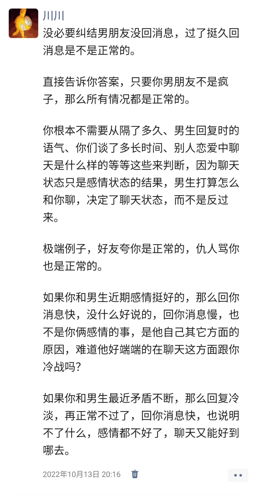你根本不需要从隔了多久、男生回复时的语气、你们谈了多长时间、别人恋爱中聊天是什么样的等等这些来判断,因为聊天状态只是感情状态的结果,男生打算怎么和你聊,决定了聊天状态,而不是反过来。