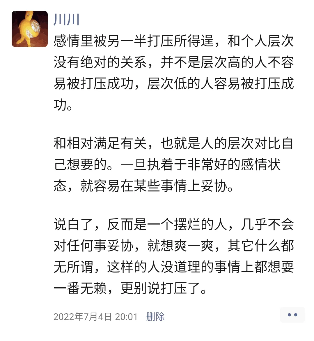 感情里被另一半打压所得逞,和个人层次没有绝对的关系,并不是层次高的人不容易被打压成功,层次低的人就容易被打压成功。