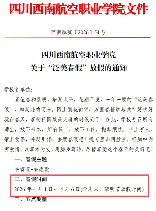 近日,西南航空职业学院发布通知,该校将于2026年4月1日至4月6日放6天春假(含周末、清明放假时间)。