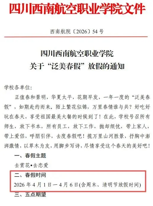 3月16日,记者从四川西南航空职业学院获悉,该校将于2026年4月1日至4月6日放6天春假(含周末、清明放假时间)