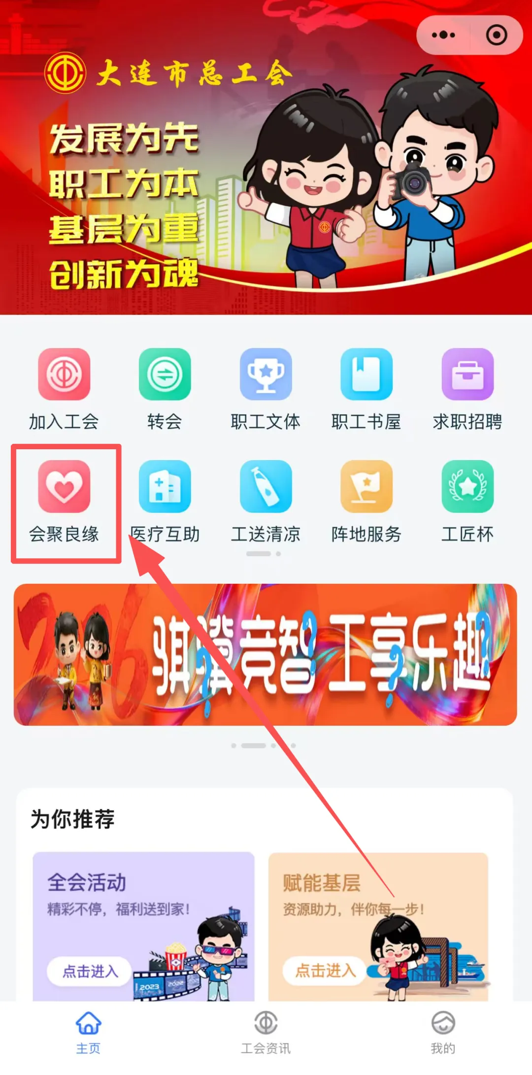 职工会员登录大连市总工会网上职工之家小程序(微信搜索“大连市网上职工之家”),进入“会聚良缘”板块。