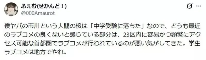 话题的起因,是一位昵称「ふぇむ」的日本网友在社交平台发文吐槽:「说起《我内心的糟糕念头》里的市川,核心设定是『考国中落榜』,这让我突然意识到,最近很多恋爱喜剧的缺点,就是舞台都在首都圈,能轻易往来东京 23 区。校园恋爱喜剧,其实应该设定在乡下啊!」