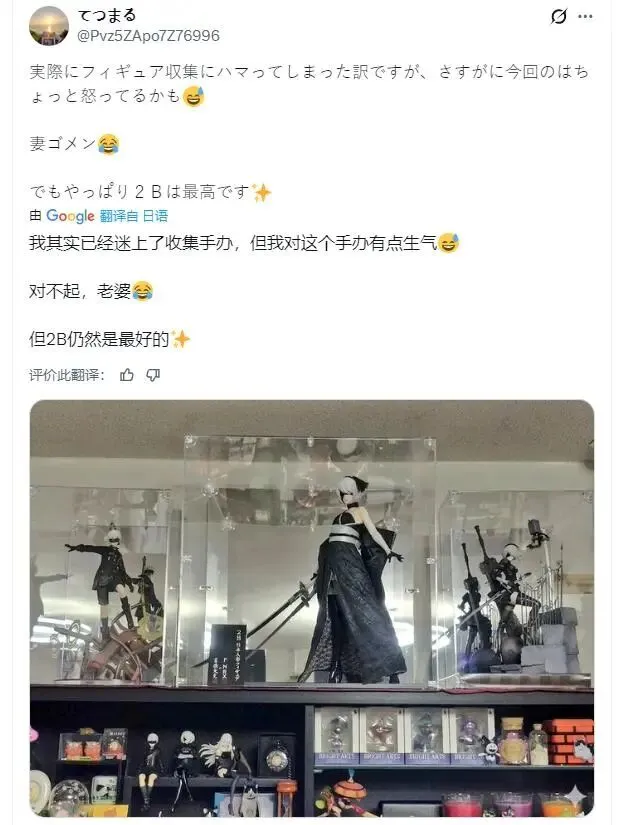 他甚至花了相当高的价格,买下一尊豪华版本的和服2B模型。发照片时他还调侃了一句:“这次老婆可能真的要生气了。”