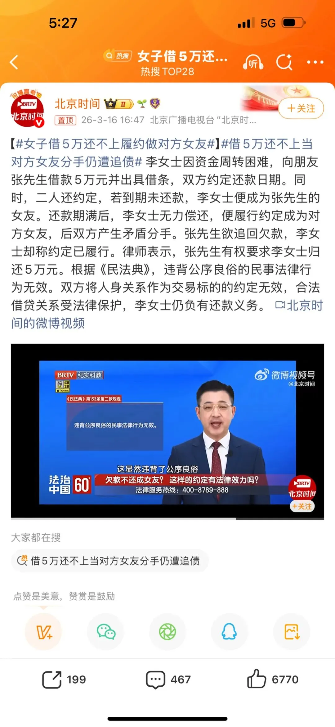 【#女子借5万还不上履约做对方女友#】#借5万还不上当对方女友分手仍遭追债# 李女士因资金周转困难,向朋友张先生借款5万元并出具借条,双方约定还款日期。同时,二人还约定,若到期未还款,李女士便成为张先生的女友。还款期满后,李女士无力偿还,便履行约定成为对方女友,后双方产生矛盾分手。张先生欲追回欠款,李女士却称约定已履行。律师表示,张先生有权要求李女士归还5万元。根据《民法典》,违背公序良俗的民事法律行为无效。双方将人身关系作为交易标的的约定无效,合法借贷关系受法律保护,李女士仍负有还款义务。 (北京时间)