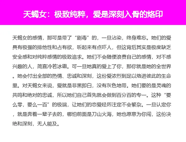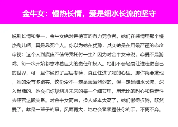 哎,你们有没有发现啊,身边总有那么一类女生,她们的感情史看起来特别“单薄”,好像没怎么谈过恋爱。但你可别误会,这绝对不是没人追或者没行情!恰恰相反,是因为她们对待感情太认真、太慎重了。不爱的时候清醒独立,一旦爱了,就是奔着一辈子去的,那股子执着和专一的劲儿,真是让人佩服又心疼。在十二星座里,就有这么三位“狠角色”,她们不轻易动心,可心门一旦被叩开,那就是一生一世的契约。今天咱就来聊聊,哪些星座女具备这种“要么不爱,要爱就是一辈子”的珍贵特质。