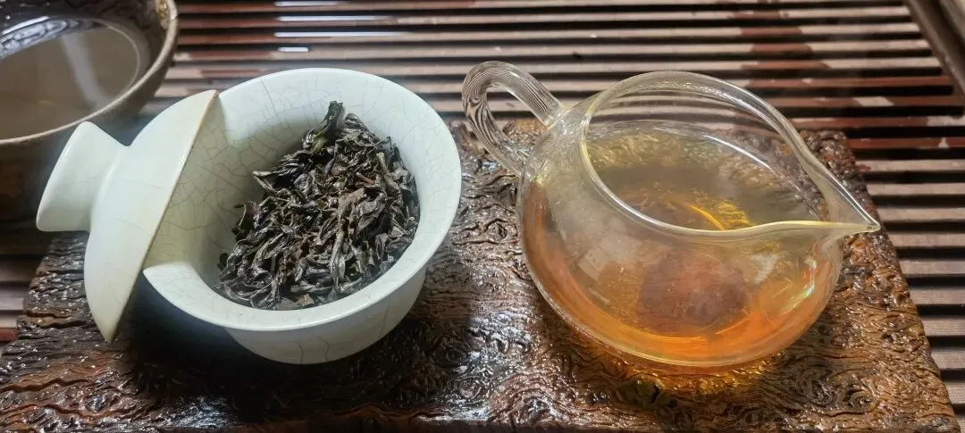 第二、三道水,茶汤里除了大桂皮香,还绽放出浓郁的玫瑰花香,辛辣感仍在,竟和火气搅在一起,生出点烟熏的风味。茶水依然甜得出挑,咽下去后返上来的茶韵,也以甜蜜为主旋律——甜过一会儿,才微微泛起一丝涩感,就像春天里带着水汽的新绿,嫩得能掐出水来。说它是甜涩若初恋,倒很贴切。茶水细腻油润,饱满到近乎粘稠,喝着像给口腔镀了层甜润的膜,这滋味感实在太足了,甚至盖过了喉间那如鲠的韵致。茶气也猛,沿着脊背直窜头顶,体感强得让人出汗,头皮微微发麻——谈恋爱的后劲,大抵也就这样。