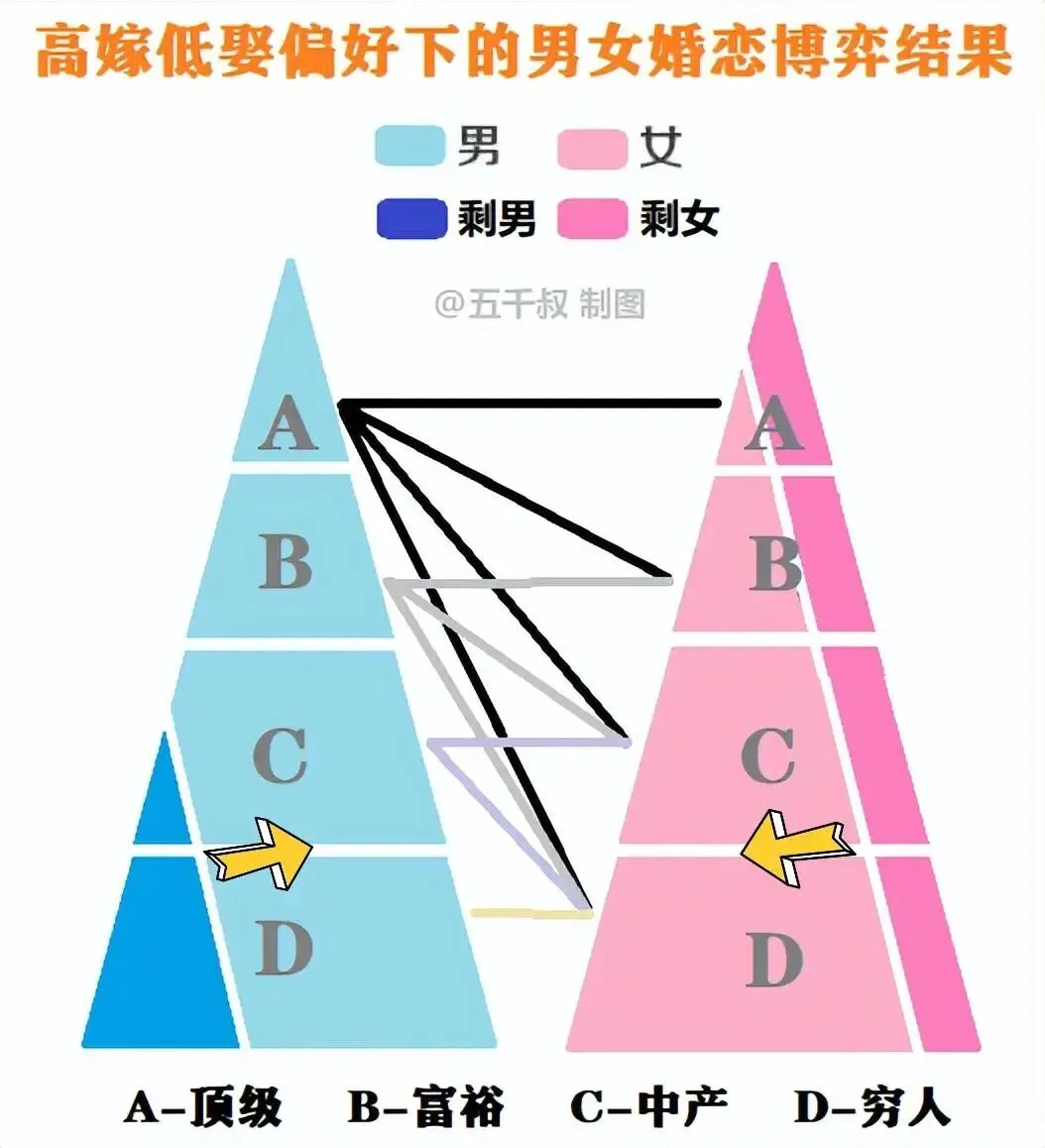 由此导致的结果,不是A男D女,而是如上图所示,每一个阶层的女性都有一部分选择不婚,而大量的穷男和一部分中男在竞争中被剩下。
