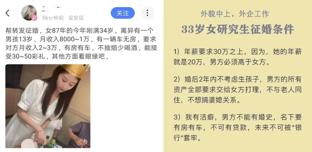 中女的目标会瞄准财产和收入与自己相当或者更优的男性。从相亲市场的女方所提条件来看,年薪30万,有房有车,上交工资,不与公婆同住,是基本要求。