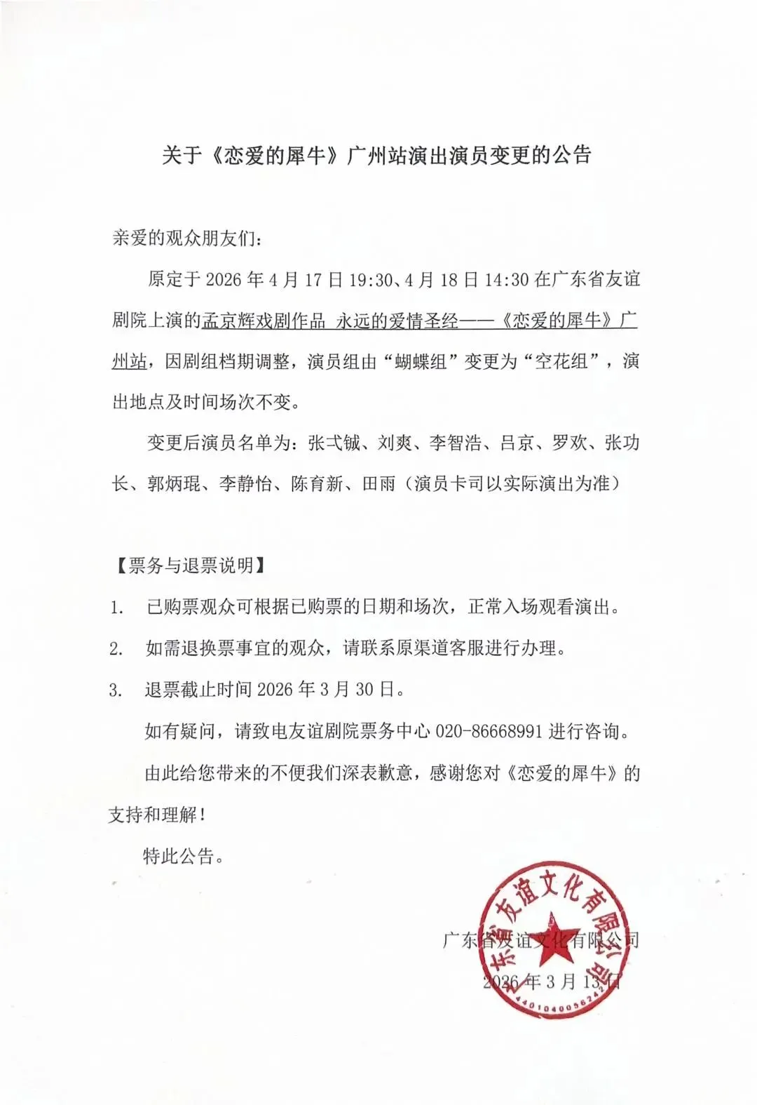 关于《恋爱的犀牛》广州站演出演员变更的公告