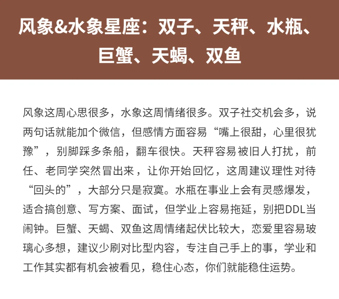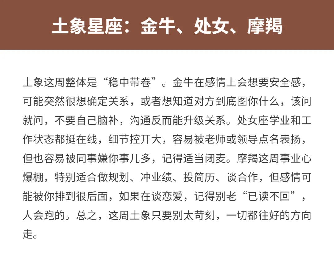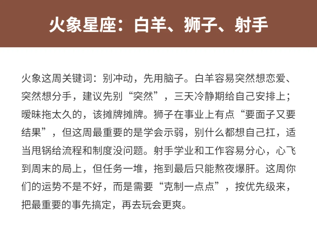 这周的十二星座,说句实话:有人开挂,有人清醒,有人被迫成长。别紧张,这不是吓你,而是提醒你,别再瞎忙活了。感情、学业和事业,这三块儿就是你这周的主战场。有人要理清暧昧,有人要补作业,有人要对老板微笑,同时暗暗更新简历。你要做的,就是认清自己属于哪一挂,顺势而为,别和运势硬刚。下面我按火象、土象、风象、水象分组来说,你对号入座就行,能不能少踩坑,就看你愿不愿意真诚面对自己。先赞后看快来接!