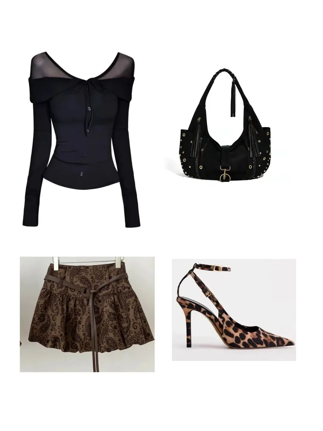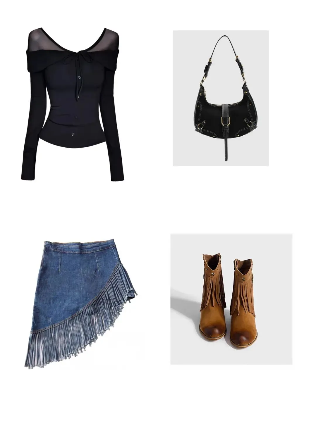 鞋子:流苏和铆钉的点缀,和裙子的流苏隔空呼应,这套穿搭的第一个呼应。