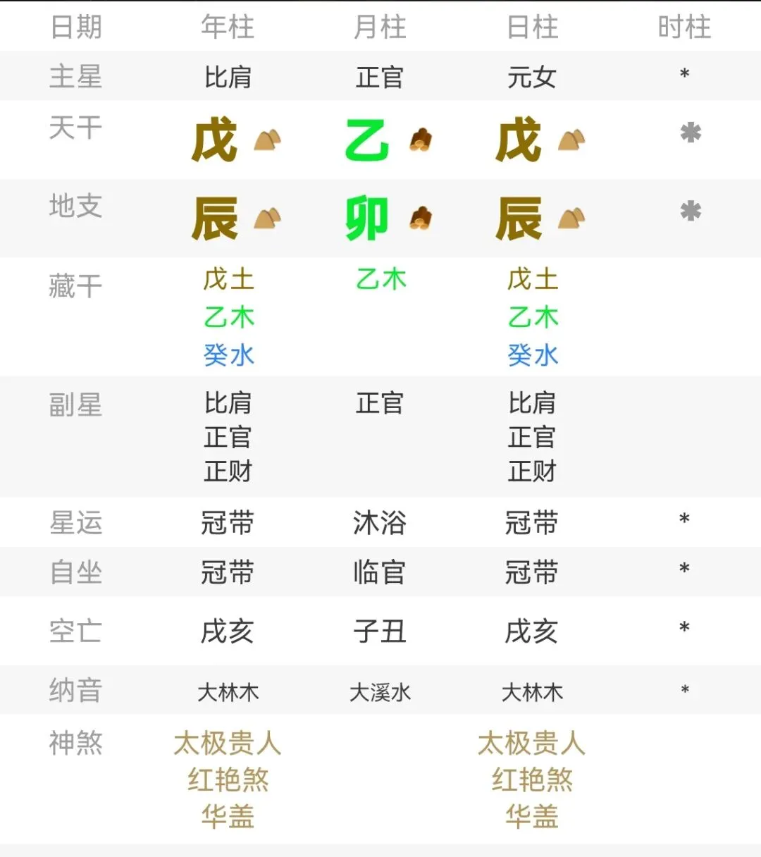 听完我就很想去看看她的八字,验证一下是不是真的。根据公开信息,马思纯的八字前三柱是:戊辰 乙卯 戊辰。时柱未知,但单看这三柱,信息量也足够了。