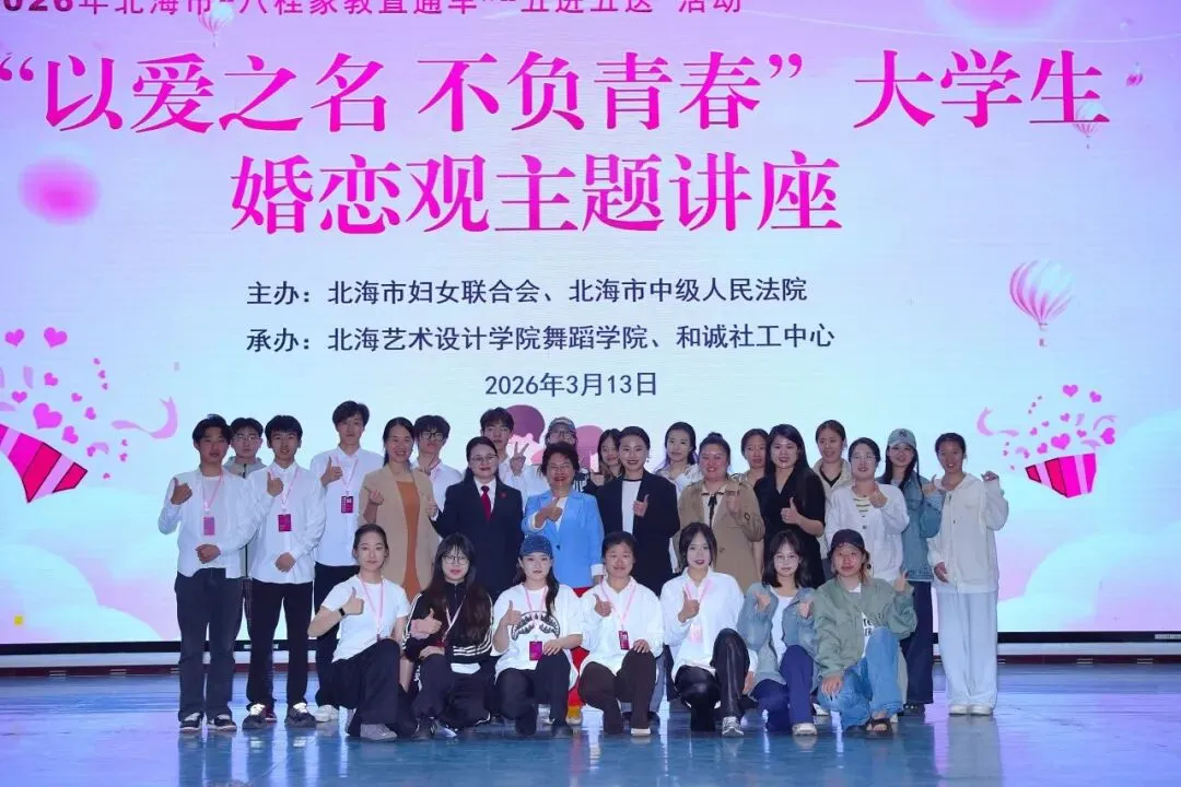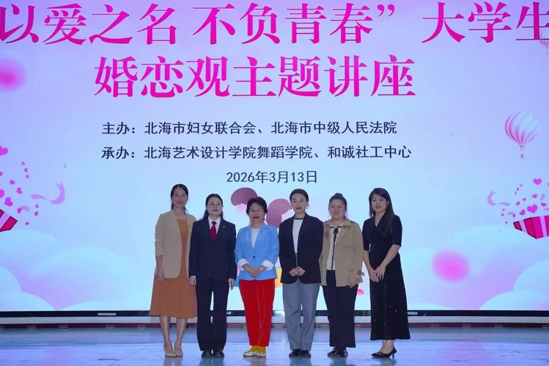 为引导大学生树立健康、理性的婚恋观,构建和谐亲密关系,近日,由北海市妇女联合会、北海市中级人民法院主办,北海艺术设计学院舞蹈学院、和诚社工中心承办的“八桂家教直通车”“五进五送”之“以爱之名不负青春”大学生婚恋观主题讲座和法治进校园志愿服务活动,在我校西校区大礼堂顺利举行。舞蹈学院党支部书记宋慧敏主持讲座。北海市妇联党组成员、副主席、二级调研员余梅,舞蹈学院常务副院长邓欢,北海市妇联家庭和儿童工作部部长王晓峰等领导嘉宾出席活动。