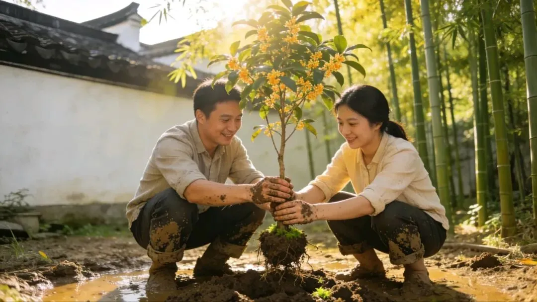 我蹲下来,把带来的树苗从布袋里轻轻取出。那是一棵桂花树苗,我从江南带来的,根上还包着故乡的泥土。