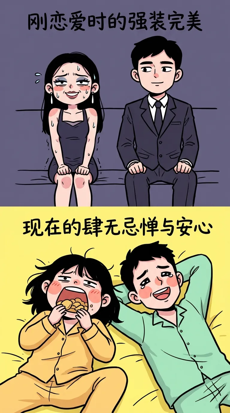 所以刚恋爱时,我们都在强撑着扮演一个“完美的成年人”。但健康的关系,本质上是一场安心的“卸妆”。