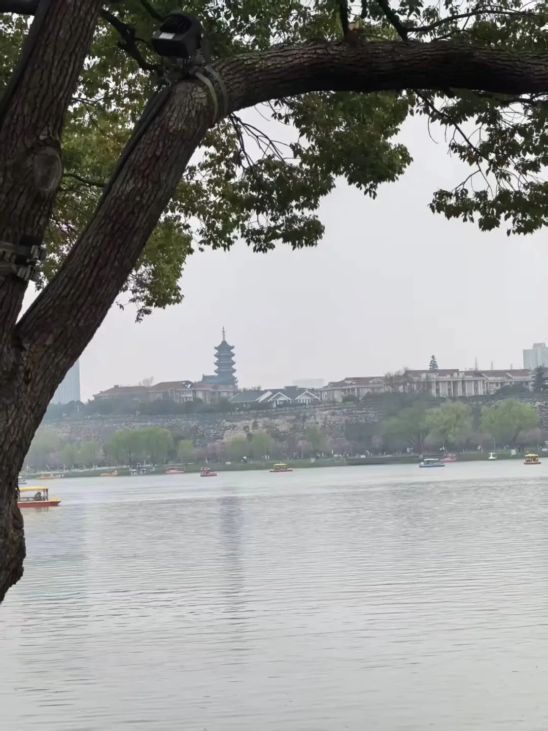 几乎是同一时间,女儿也发来了一张照片——前景是古树虬枝,中景是平静的湖面,远景是鸡鸣寺佛塔。