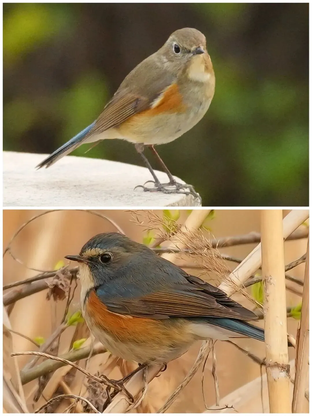 红胁蓝尾鸲:雄鸟蓝背红肋,尾巴一翘,妥妥的“冷色调潮男”;雌鸟呢?橄榄褐色+淡淡蓝尾,低调得差点被当成枯叶。