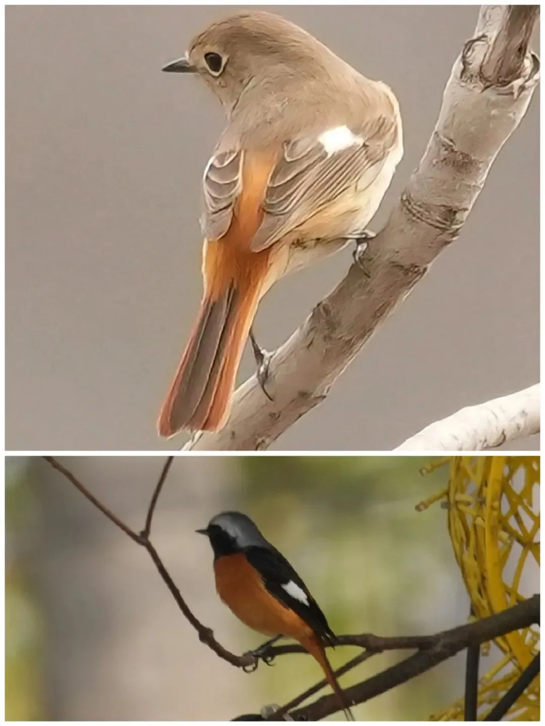 北红尾鸲:雄鸟一身橙红配黑,像穿了件小西装;雌鸟却灰扑扑,活脱脱一只“高级麻雀”。
