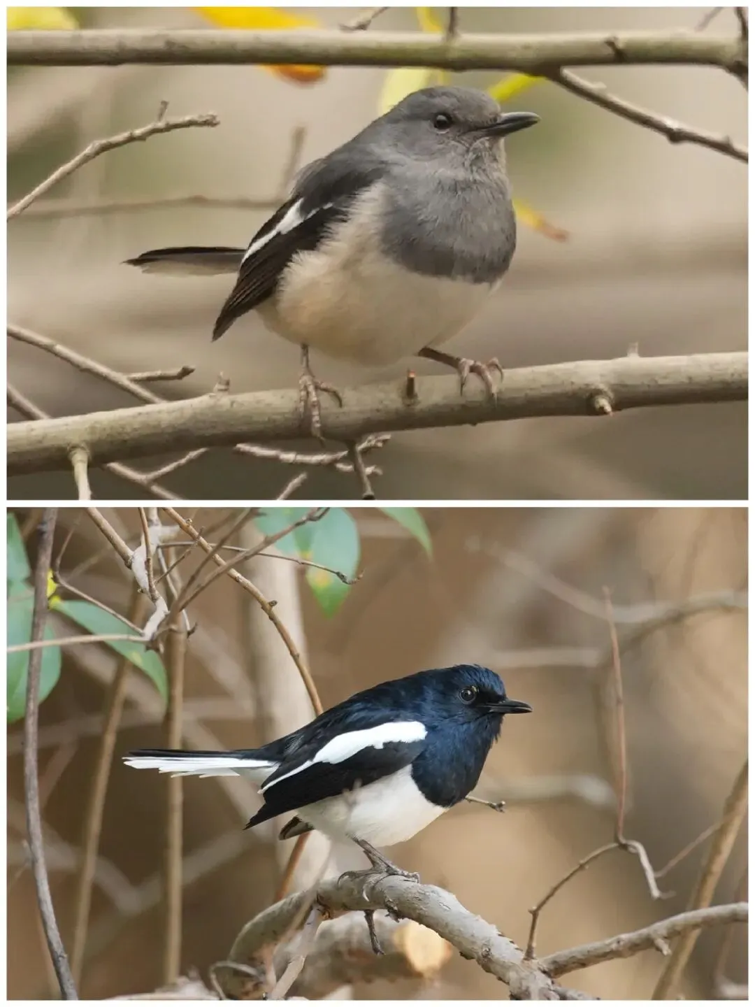 鹊鸲:雄鸟黑白分明,神似迷你版喜鹊,走路都带风;雌鸟的黑白对比却柔和许多,仿佛打了柔光滤镜。