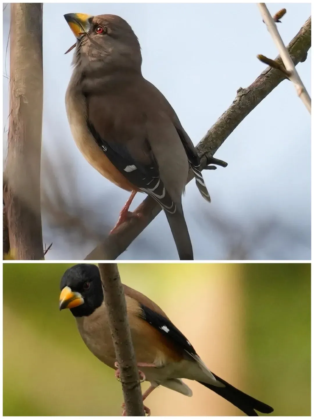 黑尾蜡嘴雀:雄鸟头黑如墨、喙粗如钳,气场两米八;雌鸟则顶着个“灰毛头”,温温柔柔。