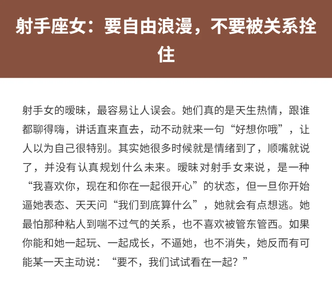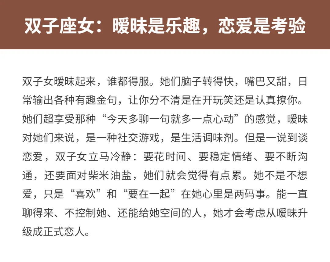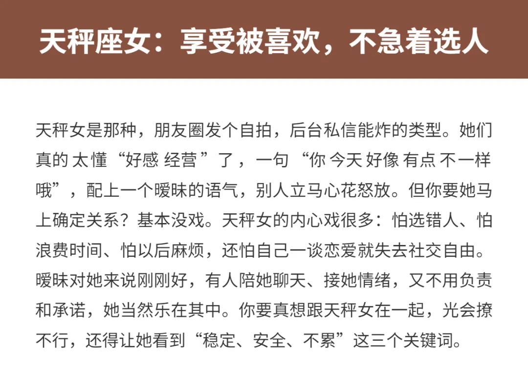 有些女生啊,你跟她聊得火热,以为下一秒就要在一起了,结果她一句“我们还是顺其自然吧”,直接把你送回原地。不是她不懂感情,而是她真的只享受暧昧带来的那种小心动、小期待,但一到“确认关系”这一步,就开始犹豫、退缩、装糊涂。别急着骂“渣”,她们很多时候也很真诚,只是对“谈恋爱”这件事,要求太高、顾虑太多。今天就来聊聊,那些明明很会撩、氛围感拉满,却总卡在“暧昧不成爱”阶段的三大星座女,看看你身边有没有这样的她。