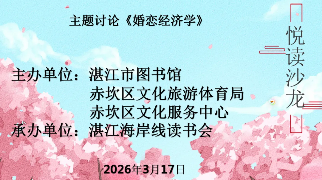 书香润心,思辨同行。2026年3月17日晚,由湛江市图书馆、赤坎区文化旅游体育局、赤坎区文化服务中心联合主办,湛江海岸线读书会承办的“悦读沙龙——《婚恋经济学》读书分享会”,在赤坎区文化服务中心举行。来自各行各业关注婚恋话题的读书爱好者齐聚一堂,以书为桥,以话为媒,围绕当代约会中的消费、性别与期待等热点话题,展开了一场兼具理性思考与情感温度的深度交流。