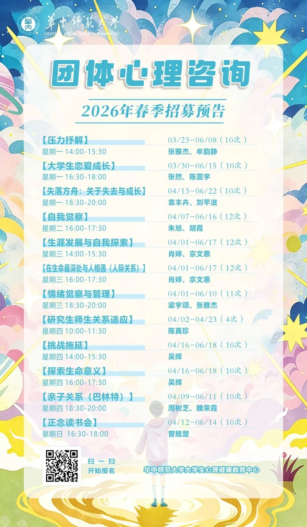 (4)团体咨询的地址为文华公书林三楼西侧心理中心301团体室,需提前10分钟达到