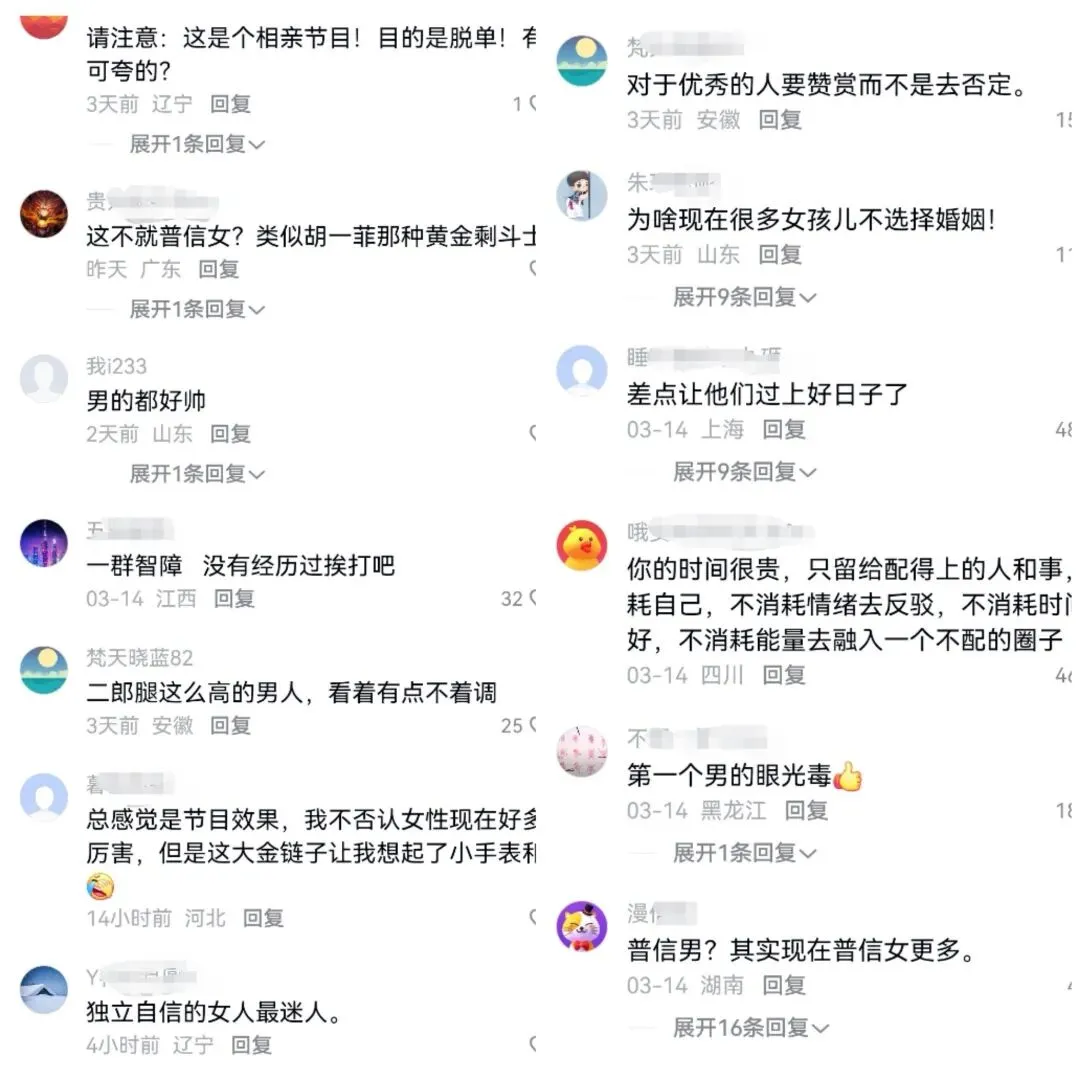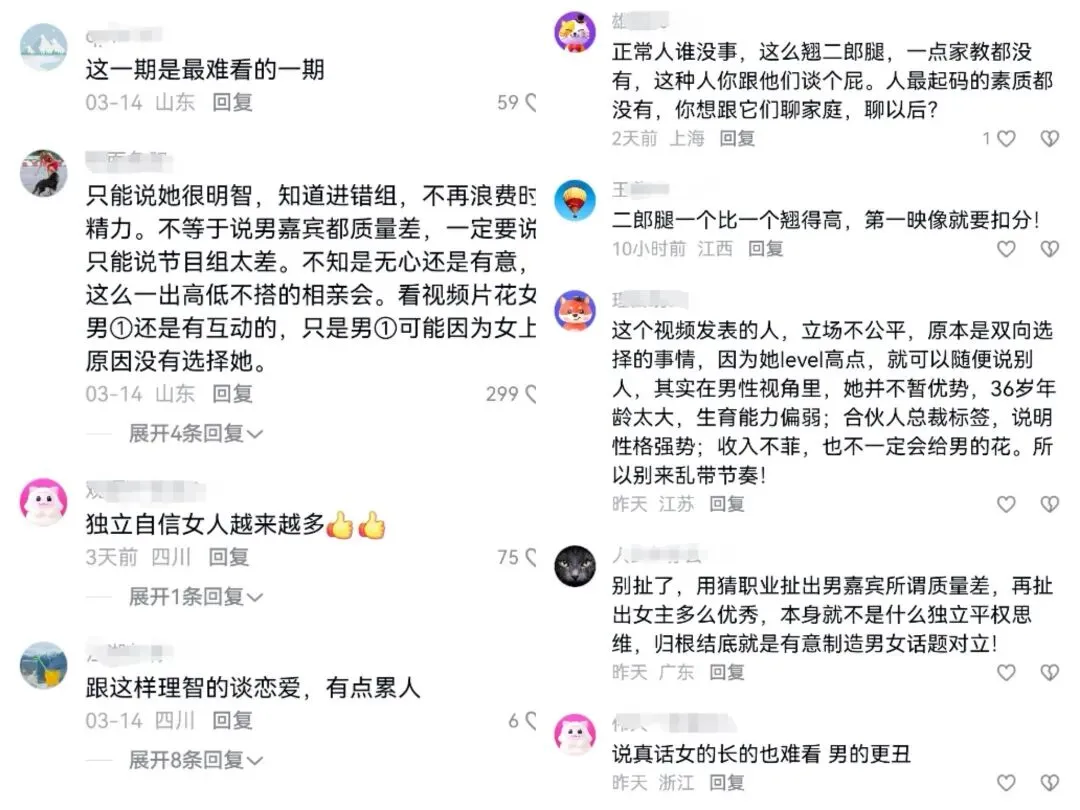 评论区里有一位网友的留言值得深思:“你看那几个男嘉宾翘着二郎腿的坐姿,但凡有点社会阅历的人都看得出不合适,节目组会看不出来?”