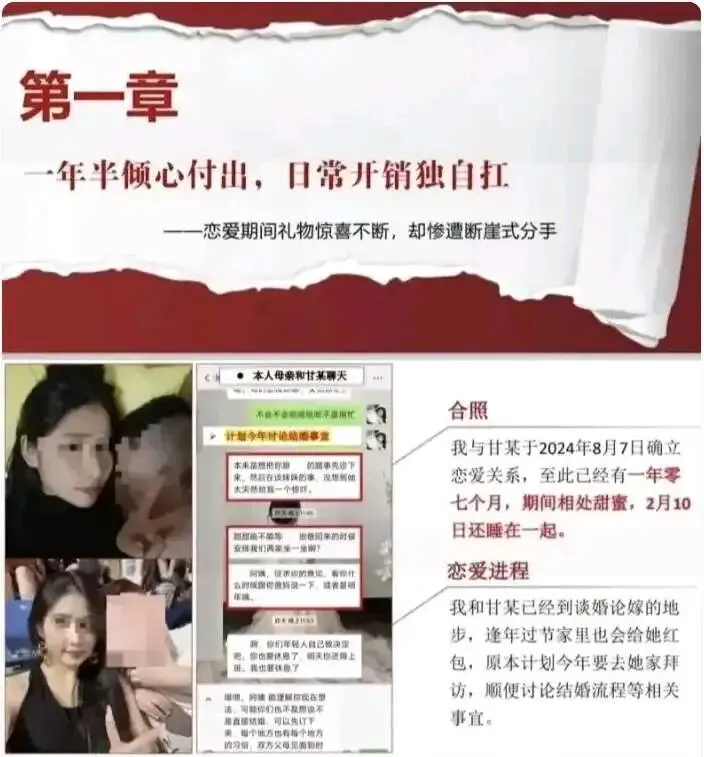 2024 年 8 月,25 岁的甘某与男友确立关系后很快同居。在这段持续 19 个月的感情里,男方扮演着传统意义上的 "好男友" 角色:独自承担房租水电,购置金镯子、电动车等贵重物品,甚至规划着将老房过户作为婚房。