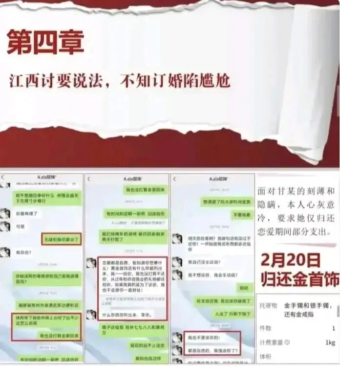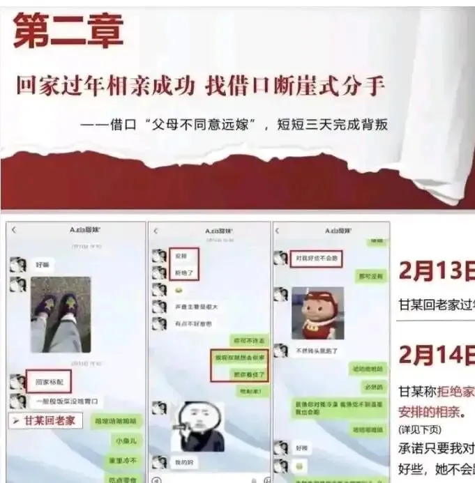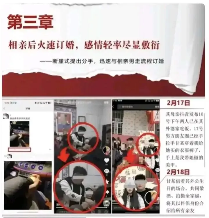 感情的裂痕在春节前后逐渐显现。2 月 14 日情人节,甘某给男友发微信 "别去相亲,我还没想好",两天后却出现在与相亲对象的订婚现场,当场收下两万定金。更具讽刺意味的是,签完协议回家路上,她还语音安抚男友 "最近太累了,别催"。这种时间管理的 "精准" 令人咋舌:订婚前三天删除聊天记录,订婚当天从后门溜走避开男友,下午三点戴着新钻戒敬茶,晚上十一点前任的 27 页 PPT 已传遍本地相亲群。