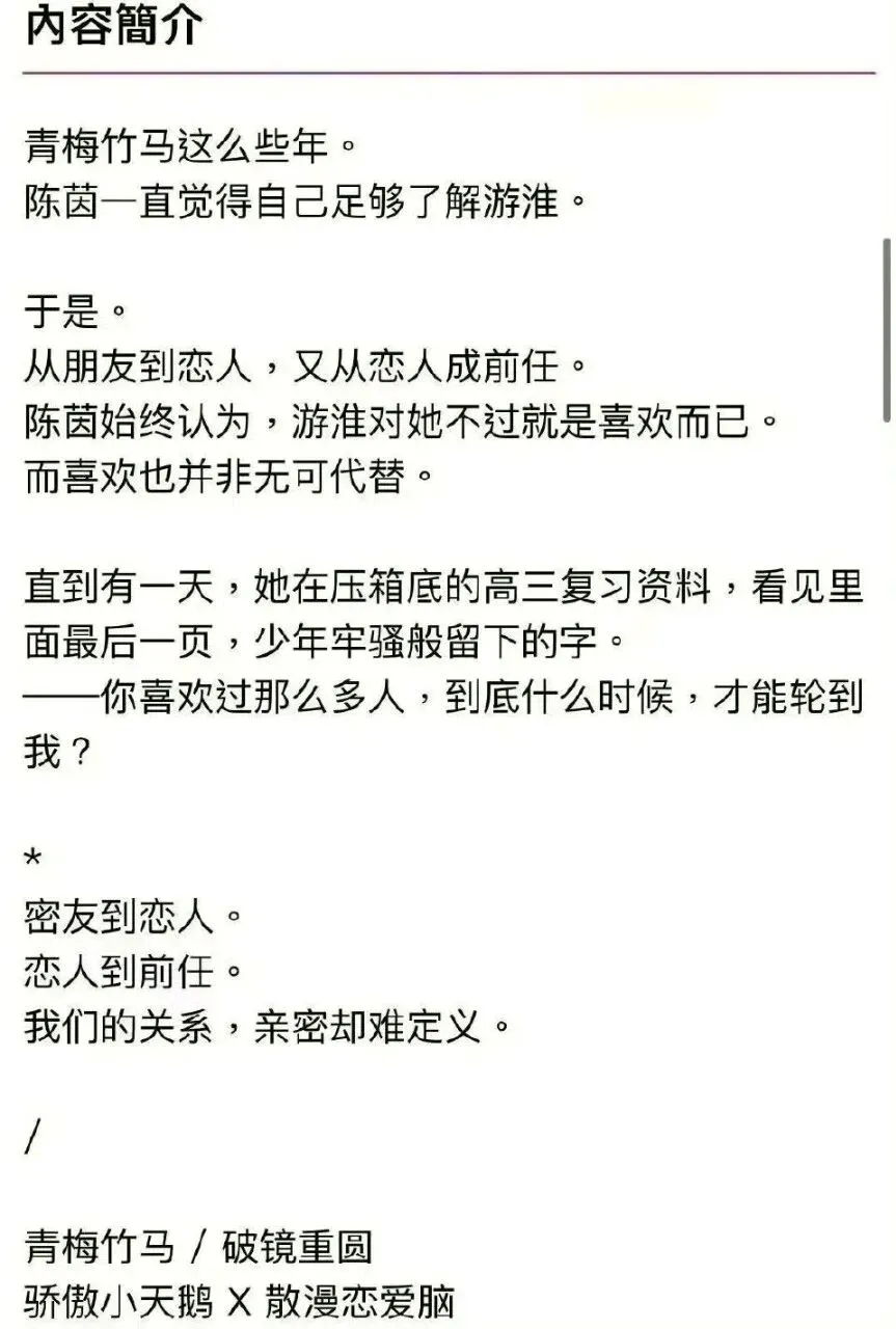 破镜重圆青梅竹马太好哭了!两人从小到大形影不离,从朋友到恋人,又从恋人成前任。女主一直觉得男主对她只是喜欢而已,喜欢并非无可替代。直到女主在高三复习资料最后一页看见男主写的你喜欢过那么多人,到底什么时候,才能轮到我?男主是坚定的唯女主主义者,分手后变得很有攻击性,重逢后勇敢表白。从头到尾只认定女主一个人。 特别香!!值得冲!