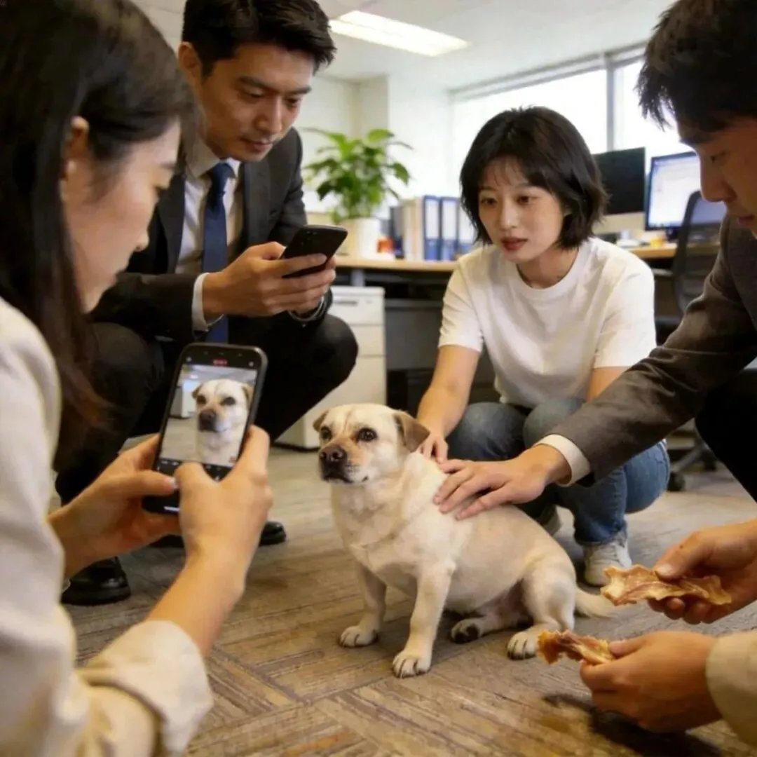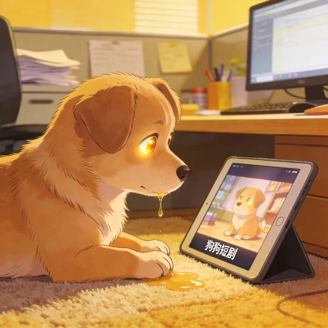 两人正吐槽呢,转头就看见工位角落的名场面——肉丸子安安静静趴在地毯上,小脑袋仰得老高,眼睛直勾勾盯着象羽相的平板,连尾巴都忘了摇,口水顺着嘴角往下滴,看得比谁都入迷。