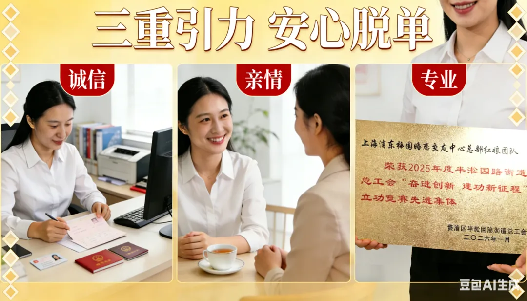 (图中奖牌由黄浦区半淞园路街道总工会于2026年1月授予)严格执行身份证、学历证、婚况证明的原件查验与复印件留存机制,针对特殊身份还会额外核对,规范流程着力提升服务的安全感和信任度。