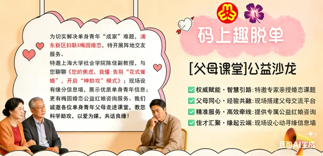 「父母课堂沙龙活动」还在为孩子的终身大事犯愁吗? 浦东新区妇联和梅园婚恋联合推出的「父母课堂」公益沙龙将于本月3月19日举行,专家教您如何科学助攻!