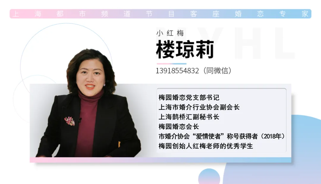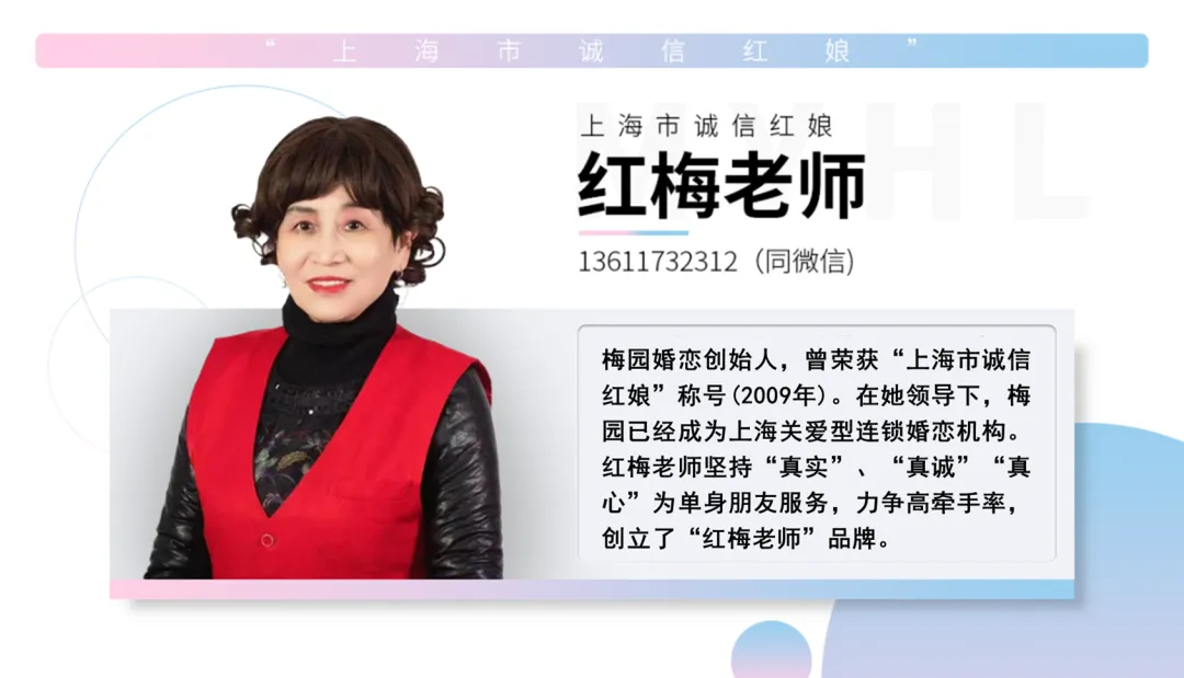 上海梅园婚恋交友中心,红梅老师品牌创立27年,曾荣获上海市第十届婚恋博览会组委会颁发的“婚介服务规范,诚信婚介机构”(2018年)和“优秀婚恋机构”称号(2018年)。