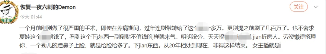 不得不说女主播们的大哥完全就是衣食父母来着,这不最近女主播曾经的老公粉,就发文称自己一个月前做了很严重的手术,即使是自己生病的情况下,也会给这个女主转账,转了10多w吧,之前更是刷了几百万。从大哥的口气中可以看出来以前的女主播可以说是爱播,但是现在她口中的女主播变成了臭j,怎会如此?原来是因为女主播惹恼了大哥,疑似是女主播在谈恋爱期间还圈大哥米,甚至还到处搞颜色,感觉女主播有点蹬鼻子上脸了,对她那么好真的十分不理解。随后大哥还在其它主播的直播间,继续骂女主播,说话十分难听,可见大哥真的非常生气,不少网友就在下面安慰大哥不要生气了,钱白花就当白花了吧,没事的,生气对身体不好。结果没想到大哥的逆天发言更是恐怖,大哥说其实也算不上白花,女主播跟自己还是一起睡过上k次的了,没什么遗憾,就是感觉自己吧有点太窝囊了,真的要气鼠了,随后网友问其花了有600w吗?对此大哥回应600w是没有的,但是几百万是有的,随后大哥还说了细节,称女主播跟自己谈恋爱的时候,还去陪其它的男生,然后电话都不接,就在那里装睡觉。随后大哥还说女主播属于是夫妻店了,渣女不如动物,不少网友安慰其的同时,大哥还说自己的跟女主播的聊天记录更精彩,不少网友都前来吃瓜,但是大哥还并未曝光聊天记录。不少网友表示很多女主播都这样,如果真的喜欢可以娶回去的,不然的话做主播,感觉就是很难收心,毕竟外面有一群森林,怎么可能为了一棵树放弃一片森林呢,大哥话是太天真了,以为女主播是真爱,结果反过来给自己戴上帽子了。也有网友说如果自己有这么多钱的话,就刷点礼物点舞蹈打发时间,然后打打游戏就算了,在女主播身上花那么多实在不值得,对此,你有什么看法,欢迎在下面留言,我们一起来交流一下!文章基本来源于公开信息渠道网络取材,仅供大家娱乐吃瓜,切勿上升人身攻击,如有问题,请及时联系小编做处理,谢谢大家的喜欢与支持!