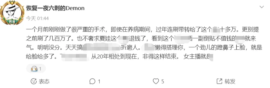 笨哥是咱们平台的一位土豪大哥,在其野性消费期间,他曾在不少直播间豪刷一番!其中对夏娃尤为支持,为其消费200w+稳居总榜一!不过就在今天凌晨,该大哥突然发鱼吧炮轰夏娃!该大哥发帖说道:一个月前刚刚做了很严重的手术,即使在养病期间,过年连刷带转给了夏娃十多万,更别提之前刷了几百万了,也不奢求夏娃退钱,但看到这个她一副倒贴不值钱的样子就来气。明明没分,天天搞些出G的事情折磨人。我懒得搭理你,一个劲儿的蹬鼻子上脸,就是给脸给多了。从20年相处到现在,非得这样结束,女主播就是X!昨晚,该大哥还现身老铁直播间吐槽道:我不在乎,吃了几千次夜宵早就腻了!谁爱要谁要,我在乎也不会骂他了!我说的都是实话,20年处到现在我真服了!现在分了,不要了!就要脸给多了,我还有的是钱,再找个就好了!稍晚期间,该大哥还在251直播间向其告别,表示:我估计退了,有缘再见!我今天真的骂爽了,憋了太多年了!我前段时间生了一场大病,这个月还在养病,很严重的病,所以我很不开心!白眼狼也就她这样的了吧,想锤早就锤S她了,骂几句得了!处了6年终于结束了,结束的很不体面,退了拜拜...值得一提的是,该大哥还发鱼吧说:所以夏娃到底说没说和“衡哥”(老铁大哥)有故事?为此衡哥直接在评论区回复:人没说,我跟老铁在直播间口嗨而已,赶紧删了吧!老铁也在直播间聊到此事,大笑说道:衡哥差点给那个老公粉气S,都是衡哥惹的祸啊,衡哥非让人家跟他吃夜宵,老公粉破防了给夏娃一顿骂!哈哈哈~目前夏娃并没有过多回应,所以大哥爆料的真实性还有待考究,希望大伙理性吃瓜!