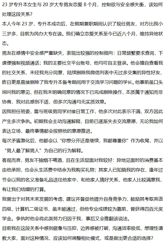 他需要调整认知,认识到:他的女朋友是一个人,活生生的人,有独立的思想意识,有她自己的需要。她可能需要男朋友的支持,但不需要被过度控制。她需要的是尊重,而不是替她做决定并行动。